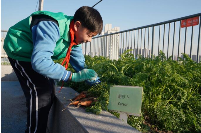 11月24日,上海华东师范大学附属进华中学学生在“屋顶生态园”里收获胡萝卜。新华社记者 刘颖 摄