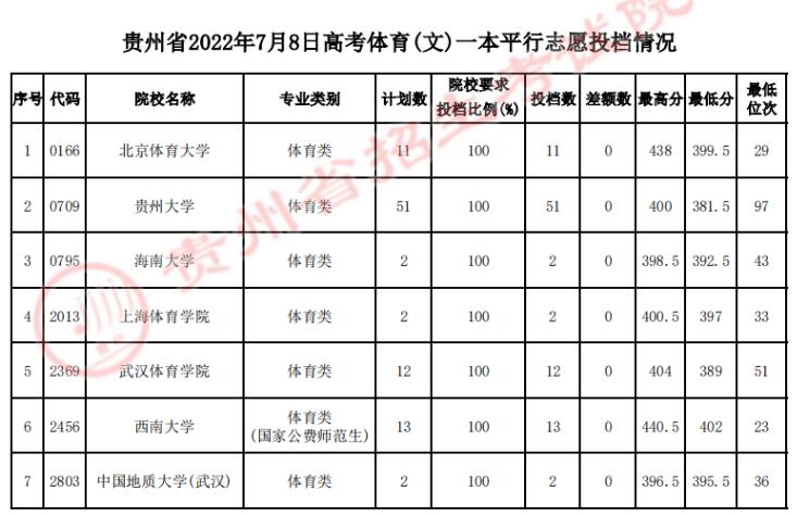 贵州省2022年7月8日高考体育一本平行志愿投档情况