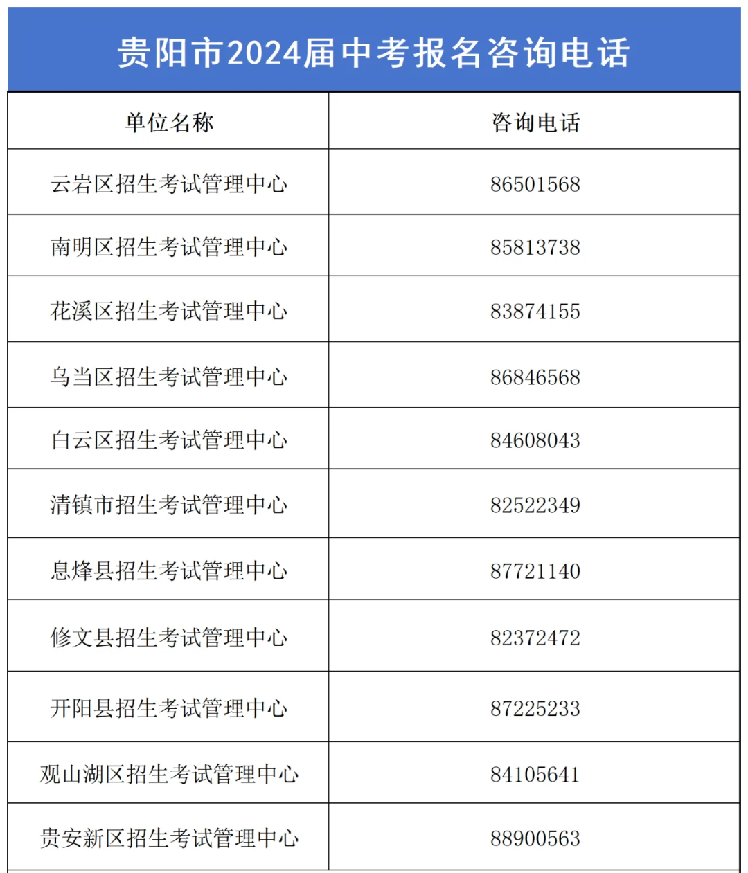 根据要求,为深入推进考试招生制度改革,促进义务教育优质均衡发展和高中阶段各类教育协调发展,维护考试招生公平,本次中考报名工作统一在“贵阳市高中阶段学校招生考试管理服务平台——报名管理系统”上进行操作,考生报考信息由各区(市、县)学校统一采集,并使用专用电脑进行报名。家长和考生可登录贵阳市招生考试管理中心网站,查询各区(市、县)中考报名咨询联系电话。报名细则如下↓↓↓