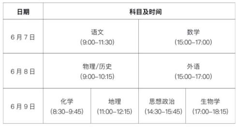 6月9日,由于每个考生选择性考试科目不同,所以一定要对照《准考证》认真核对自己的考试科目以及相应的考试时间,其中,化学08:30—09:45,地理11:00—12:15,思想政治14:30—15:45,生物学17:00—18:15。