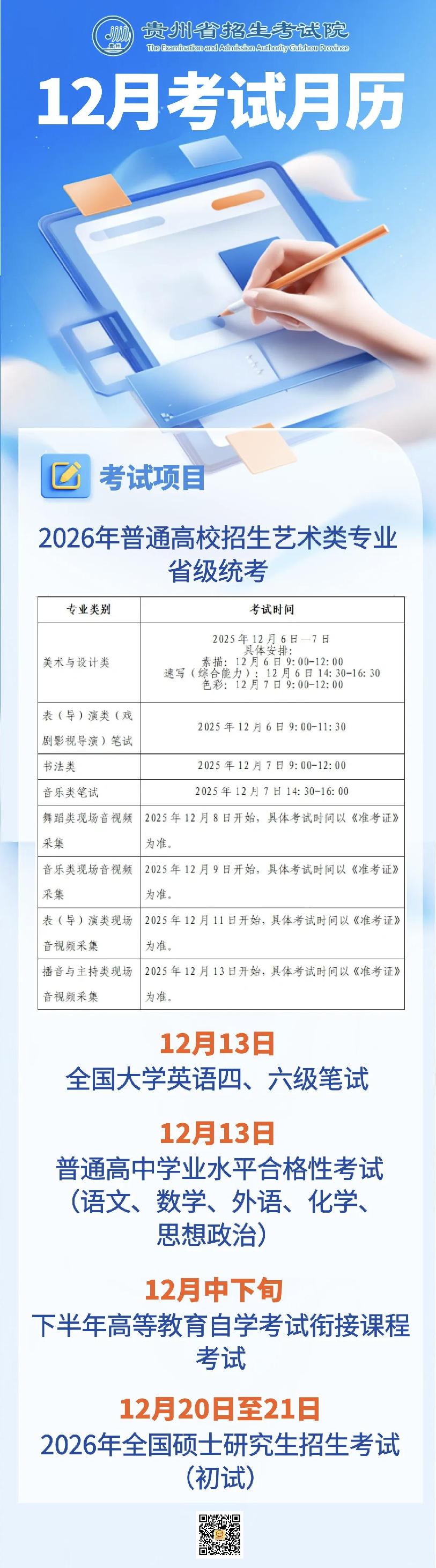 2025年12月贵州教育考试月历