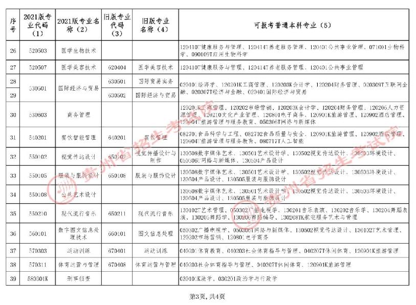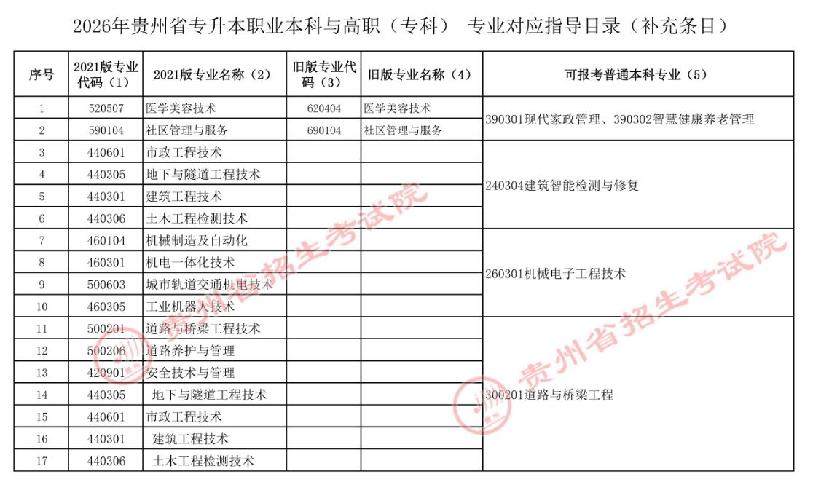 根据《教育部办公厅关于公布2026年本科层次职业教育专业设置备案结果的通知》(教职成厅函〔2026〕5号),贵州省交通职业大学2026年本科层次职业教育专业设置备案工作已完成,从2026年起开始进行专升本招生。结合我省2026年专升本考试招生报名情况,现将2026年贵州省专升本专业对应指导目录补充条目公布如下: